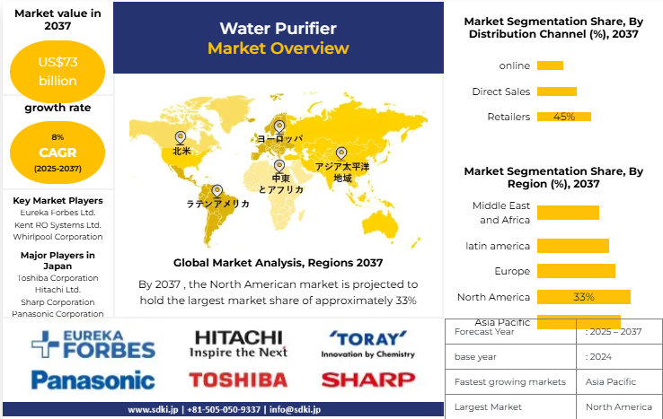 当社の浄水器市場に関する調査報告書によると、2025年から2037年の予測期間において、市場は約8%の年平均成長率(CAGR)で拡大すると見込まれています。今後数年間で、市場規模は約730億米ドルに達すると予測されています。ただし、当社の調査アナリストが基幹年度に記録した市場規模は約380億米ドルでした。現代世界は、人間活動による世界中の貯水池の深刻な汚染という課題に直面しています。