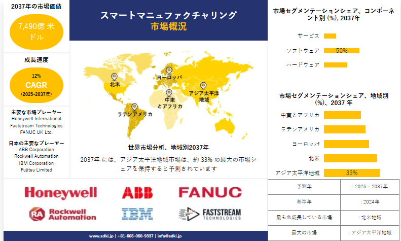 スマート製造市場は2024年に約2460億米ドルの収益を生み出した。さらに、当社のスマート製造市場分析に基づくと、予測期間中に年平均成長率(CAGR)約12%で拡大し、2037年までに約7490億米ドルに達すると予測されている。スマート製造(SM)とは、接続された機械とデジタルネットワークを活用して生産プロセスを監視・最適化する技術主導型アプローチである。その主な目的は、自動化に適した領域を特定し、データ分析を活用して製造全体の効率性とパフォーマンスを向上させることにある。